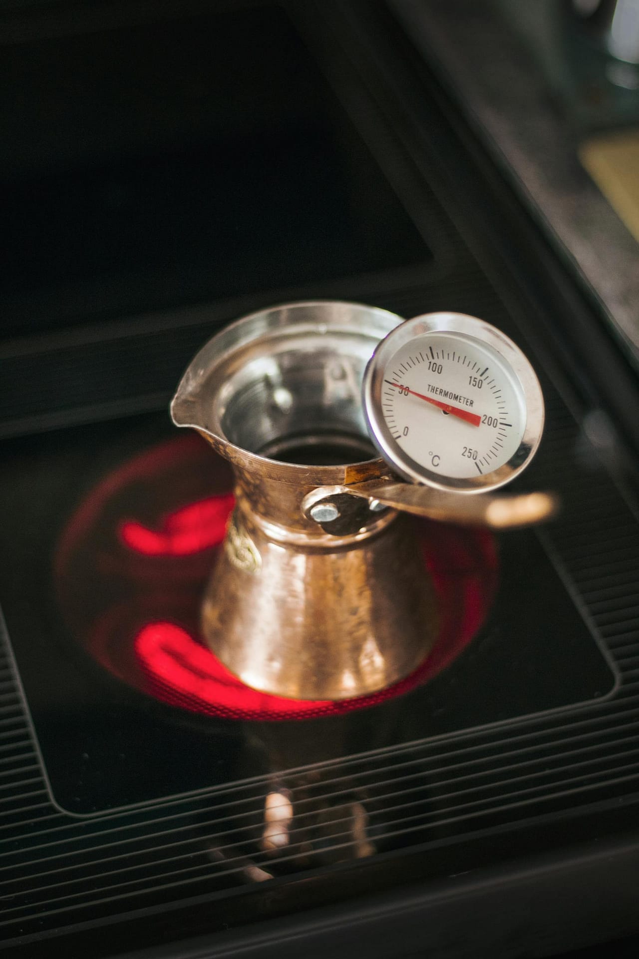 Cezve with thermometer on hot stove